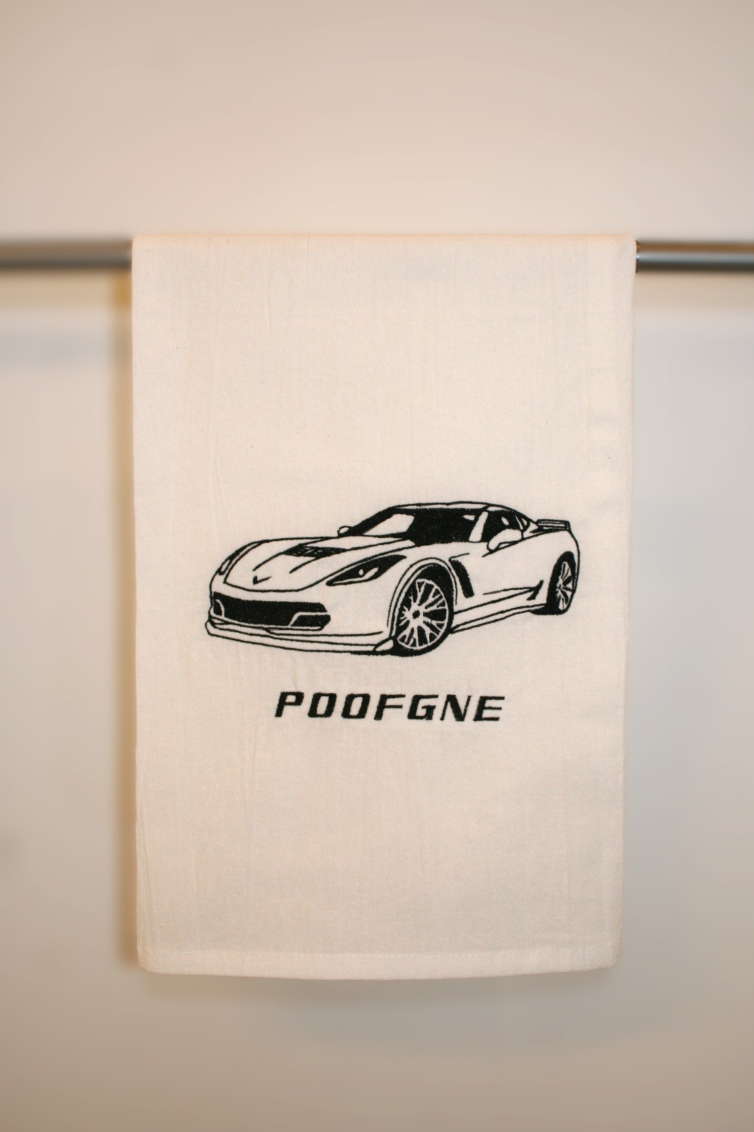 This custom tea towel showcases a Z06 Corvette silhouette, embroidered in monochrome for a clean, graphic finish. A unique piece that blends automotive heritage with personalized detail.