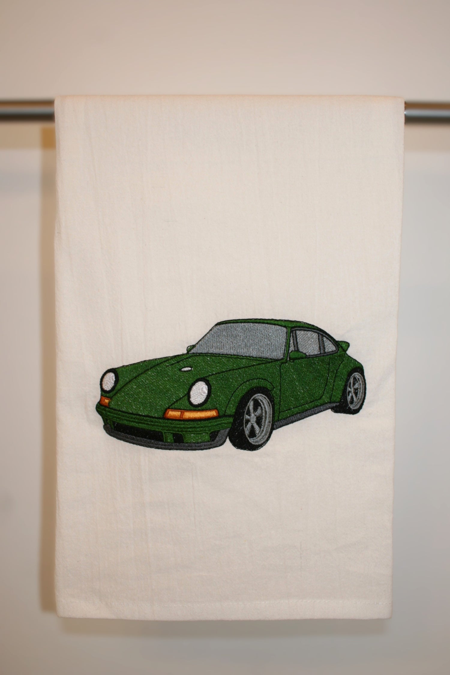 This custom tea towel features a vibrant green Porsche 911, brought to life through intricate embroidery. A one-of-a-kind piece made for the car enthusiast who knows—style belongs in every corner of the home.
