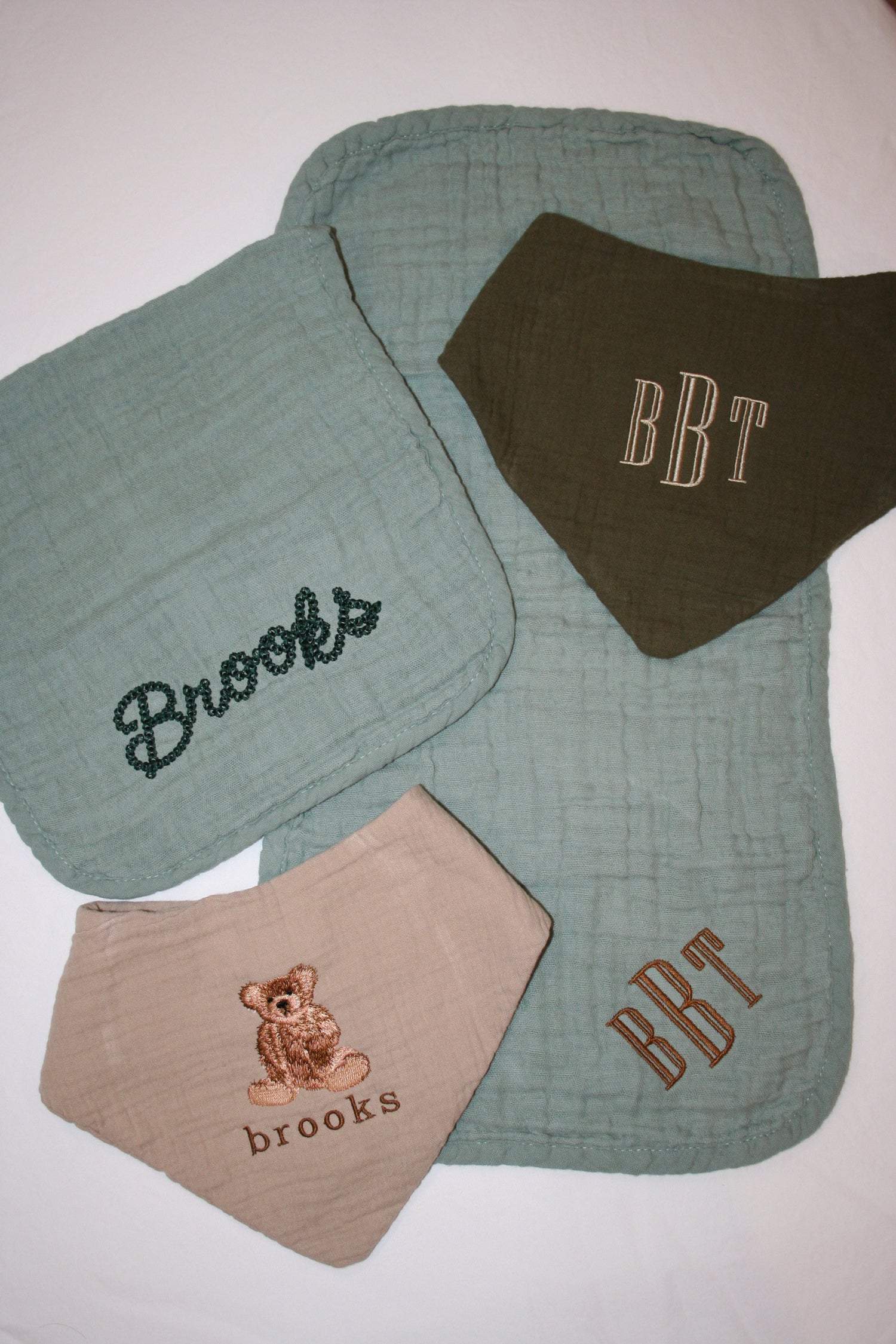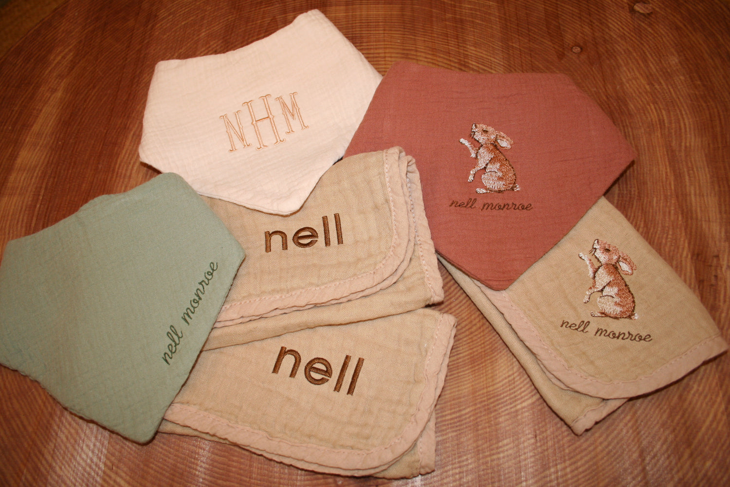 This custom bundle includes a curated mix of bibs and burp cloths, each embroidered with names, monograms, and our signature bunny motif. Thoughtfully designed in muted earth tones for a natural, elevated aesthetic. A personal and practical gift that becomes a keepsake.